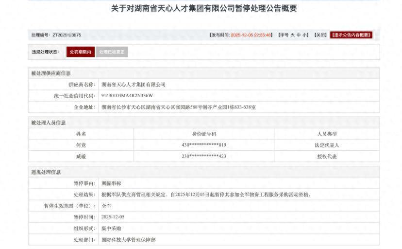 近日,军队采购网发布公告,湖南省天心人才集团有限公司在军队采购活动中涉嫌存在违规失信行为,根据军队供应商管理相关规定,自2025年12月5日起暂停其参加全军物资工程服务采购活动资格。